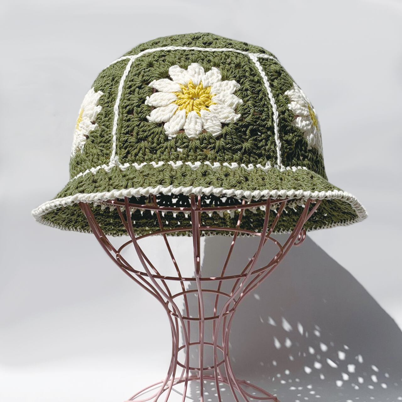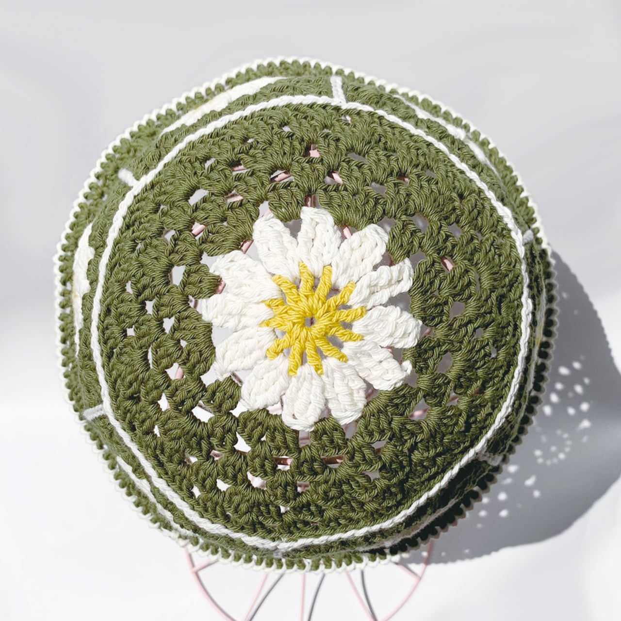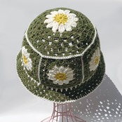 【クロシェハット】かぎ針編みのクロシェ お花のバケットハット カーキ